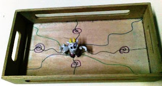 Arranjaram um boneco que esticava os braços. Colaram-no numa caixa de madeira aberta e nela fizeram desenhos. Por baixo desenharam uma mão. Ele estava pronto.