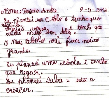 Eu gostei muito de plantar o cebolo com a professora Sara.